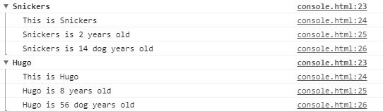 dogs.forEach(dog => { console.group(`${dog.name}`); // groupCollapsed console.log(`This is ${dog.name}`); console.log(`${dog.name} is ${dog.age} years old`); console.log(`${dog.name} is ${dog.age * 7} dog years old`); console.groupEnd(`${dog.name}`); });