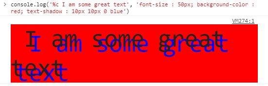 console.log('%c I am some great text', 'font-size : 50px; background-color : red; font-shadow : 10px 10px 0 blue');