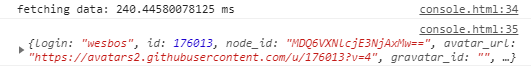 console.time('fetching data'); fetch('https://api.github.com/users/wesbos') .then(data => data.json()) .then(json => { console.timeEnd('fetching data'); console.log(json); });