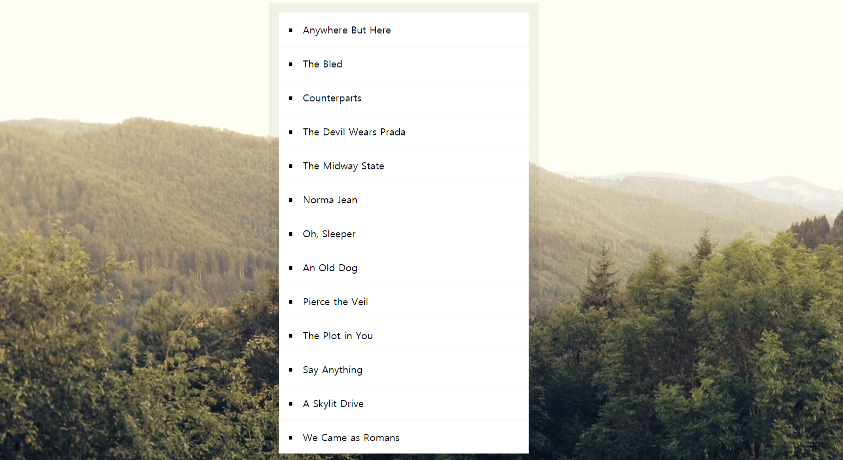 document.querySelector('#bands').innerHTML = sortedBands.map(band => `<li>${band}</li>`);요렇게 화면에 뿌려보면, 다음과 같은 결과물이 화면에 뿌려지게 될 것이다.