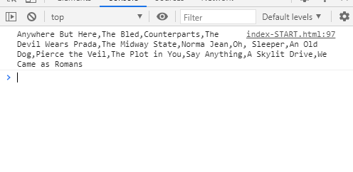 밴드 이름들이 콤마를 기준으로 문자열로 합쳐졌다. 이런 참사를 막기 위해, 우리는 저 배열에다가 join 메서드를 사용해줘야 한다.