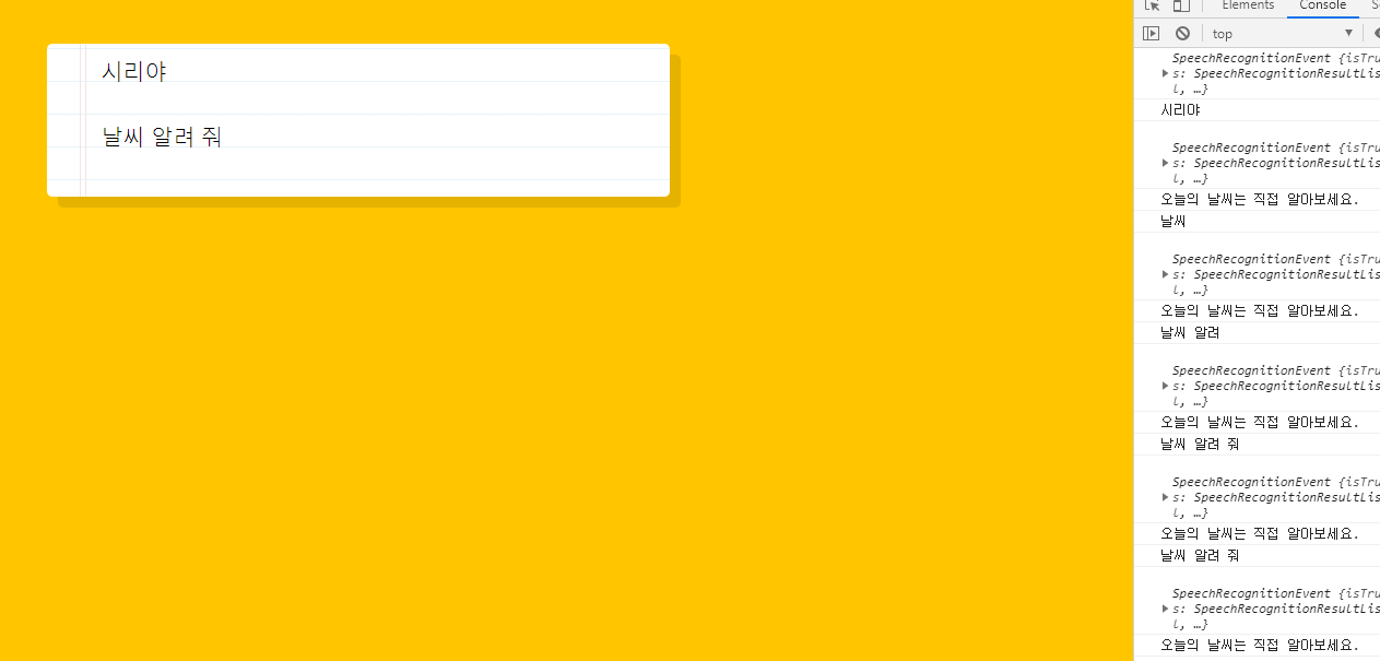 <script> window.SpeechRecognition = window.SpeechRecognition || window.webkitSpeechRecognition; const recognition = new SpeechRecognition(); recognition.interimResults = true; let p = document.createElement('p'); const words = document.querySelector('.words'); words.appendChild(p); recognition.addEventListener('result', e => { const transcript = Array.from(e.results) .map(result => result[0]) .map(result => result.transcript) .join(''); p.textContent = transcript; if(e.results[0].isFinal) { p = document.createElement('p'); words.appendChild(p); } if(transcript.includes('날씨')) { console.log('오늘의 날씨는 직접 알아보세요.'); } }); recognition.addEventListener('end', recognition.start); recognition.start(); </script>+) 마이크가 해당 탭에서 인식되고 있는 상태인지를 확인할 것.