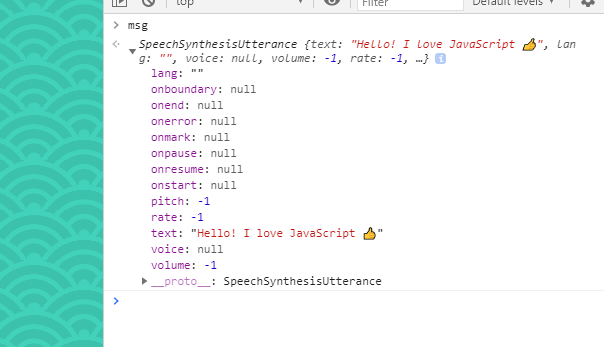 이는 'speechSynthesis'라는 객체로 존재하고, 해당 객체의 speak 메소드 안에