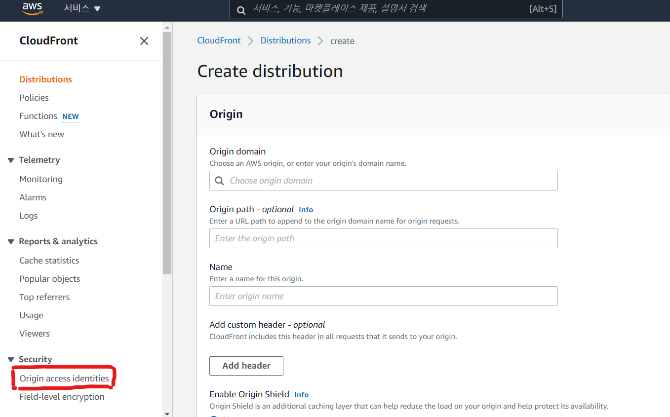 참고) 글을 다 작성하고나서 알게된 사실인데, Origin access identity(OAI, 원본 액세스 ID) 아래에 있는